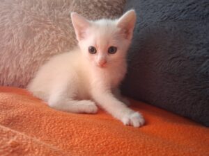12. 6. 2025 jsme přijali z obce Dunajovice bílou kočičku se čtyřmi měsíčními prcky.