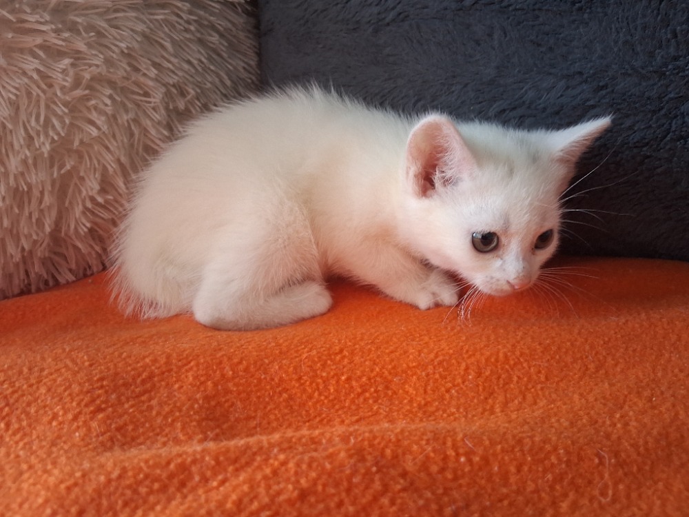 Krásná, sněhově bílá kočička - to jsem já, malinká Vanilka. Jsem lehounká jak sněhová vločka, milounká a ráda se mazlím. Miluju lezení po výškách, ráda se peru s ostatníma a jsem hodně zvídavá. Na hlavince mám takové malinké nenápadné flíčky, to proto, abych byla k rozeznání od jiných bílých kočiček. Moc ráda baštím a je to znát, protože mám krásný velký pupíček 😀 Mně to nevadí, já to brzo zase vyběhám, protože se sourozenci řádím, jako sto čertíků. Jsem čistotná, ačkoli jsme chodili na záchod jenom venku, hodně rychle jsme se naučili, že se chodí do písku, moc mě baví se v něm hrabat, to vám toho lítá ven 😀 Hledám bezpečný domov buď u kočičky nebo s nějakým z mých kámošů.